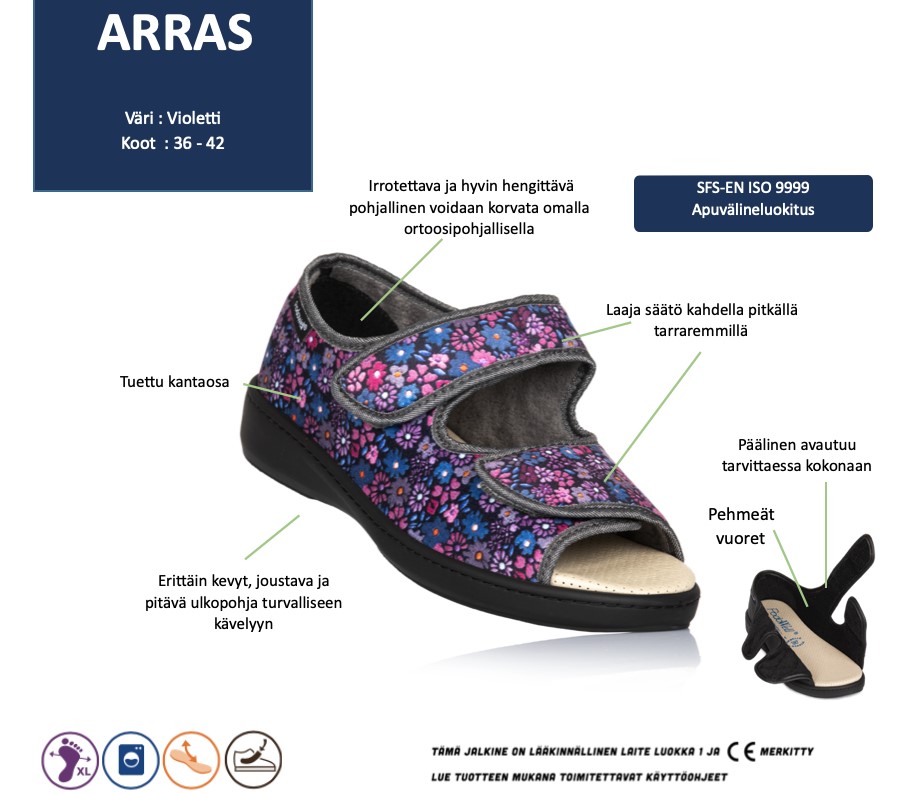 - Sopii koti- ja laitosjalkineeksi. Esim. turvonneille, operaation jälkeisille tai sidotuille jaloille
