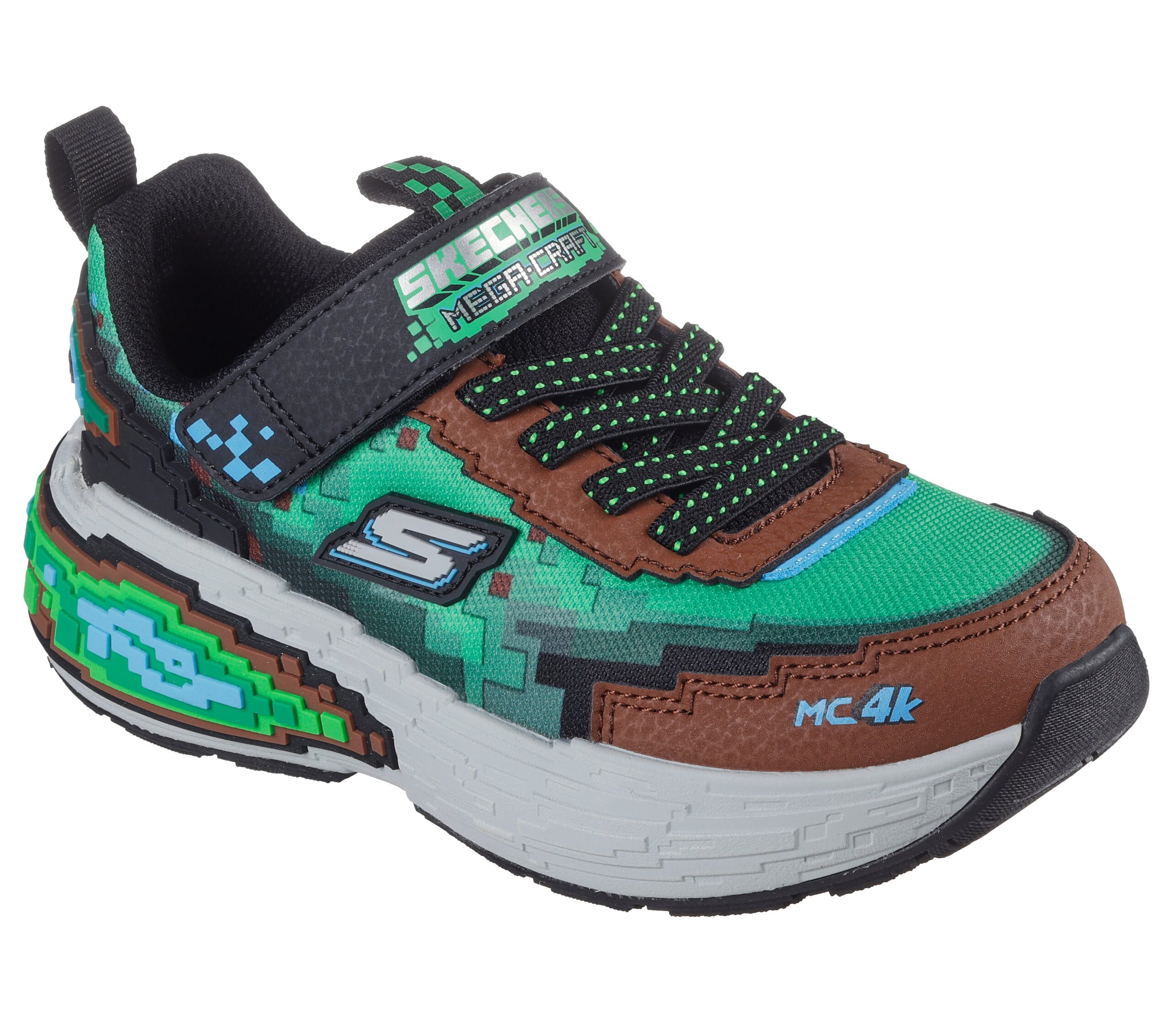 Skechers Mega-Craft® 4K on lastenlenkkari, joka yhdistää leikkisän Minecraft-teeman ja urheilullisen mukavuuden. Pikselikuvioinen synteettinen päällinen ja joustavat päällykset antavat kengille persoonallisen ilmeen, kun taas pehmustettu pohjallinen takaa mukavuuden koko päivän.